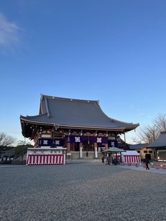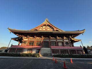 Sora no ao / YUUYAKE '22/12/31 初めての池上本門寺。駐輪場に自転車を置くと、まず視界に入ったのは、 夕日に照らされる塀と瓦。まさか本門寺だからって「本」と入った瓦だとは。大堂も夕日に照らされていた。 羽田空港からも頭が見える五重塔が赤色だとは知らなかった。東京都大田区池上。 ●TOP ●BACK ●YUUYAKE
